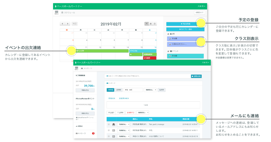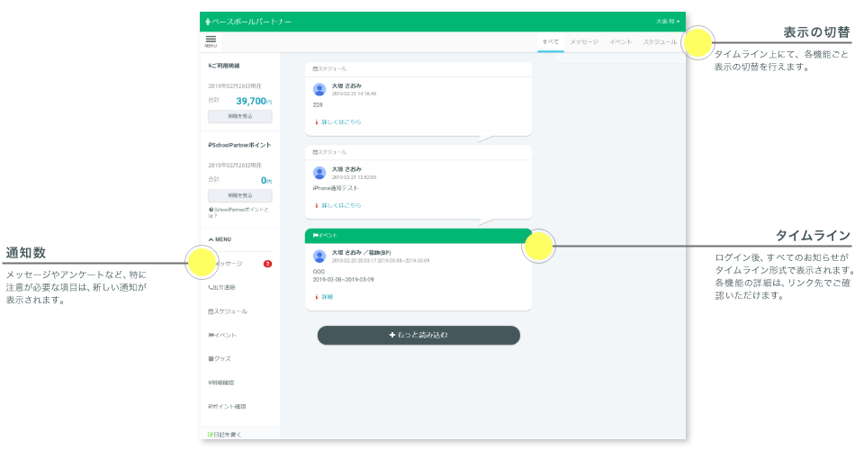 その他にも、「月謝の引き落し」「イベントの申し込み」「グッズの購入」「アンケート」などもご利用いただけます。団体様からのお知らせは、すべてトップページにタイムライン形式で表示されます。